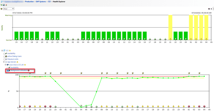 Simply pick a timeframe to look back from and “Expand Nodes in Warning or Higher” to highlight the components with offending exceptions in the past time within the window, regardless if they impacted the highest level of service health. For example, if one of the app servers' batch queue utilization reaches 100% but other app servers are still available, the overall service may be OK, but the app server level is still indicating an exception. It would be useful to investigate later the root cause of such a bottleneck. The example below highlights this scenario as one of the many potential issues: