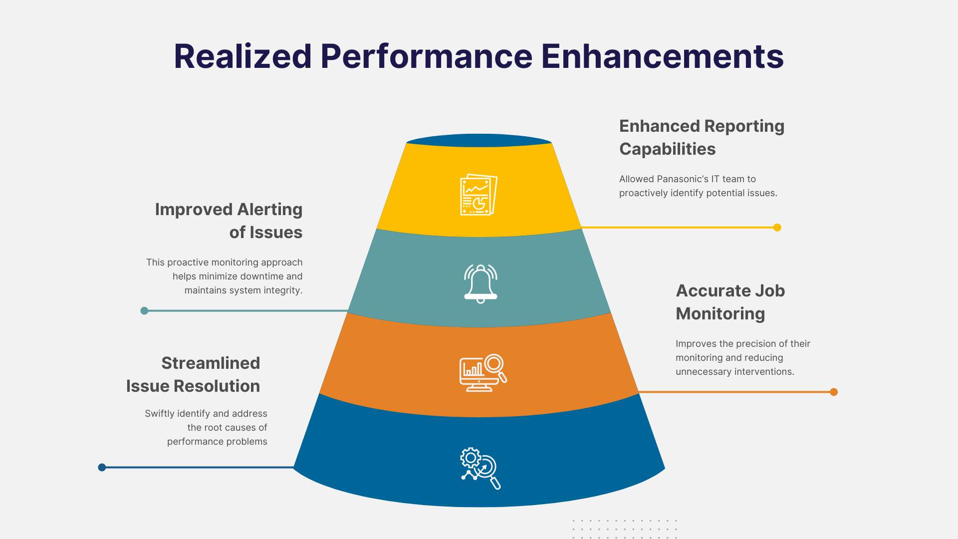 The absence of comprehensive reporting capabilities led to delays in identifying and resolving performance issues. Furthermore, the existing monitoring tools failed to provide timely and accurate alerts, leaving Panasonic vulnerable to system outages and performance degradation.